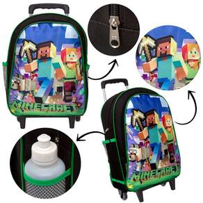 Kit Mochila Escolar Infantil Minecraft Rodinhas, acompanha lancheira e estojo. Possui alça de mão reforçada. Agora você pode levar sua mochila no seu dia a dia ou acompanhar você na escola. Sua abertura maior se dá por zíper com puxador. Na parte de dentro possui amplo espaço para a guardar diversos materiais como cadernos, livros e estojos. Na parte da frente, possui bolso com zíper para a guardar pertences de menor tamanho e bolsos laterais.