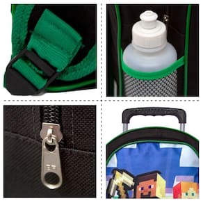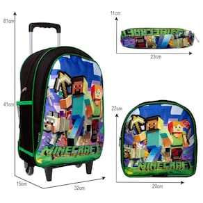 Kit Mochila Escolar Infantil Minecraft Rodinhas, acompanha lancheira e estojo. Possui alça de mão reforçada. Agora você pode levar sua mochila no seu dia a dia ou acompanhar você na escola. Sua abertura maior se dá por zíper com puxador. Na parte de dentro possui amplo espaço para a guardar diversos materiais como cadernos, livros e estojos. Na parte da frente, possui bolso com zíper para a guardar pertences de menor tamanho e bolsos laterais.