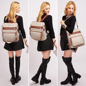 Mochila: 13,5 “L x 6" L x 14,25" H, peso: 1,9 libras; a alça removível é 12,11”. Pulseira: zíperes duplos superiores de 9 “L x 6" A bolsa pode ser como bolsa de ombro ou mochila.