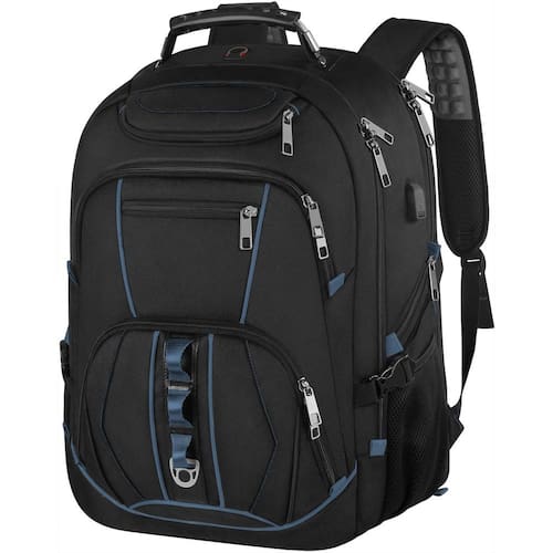 Laptop backpack - Super Large Capacity:3 spacious main multi compartments give excellent protection for a 18.4 laptop and tablet. Exterior size of the business travel backpack: 21.5*16.3*9.9 inch. Capacity: 55L. Fits most 18.4,18,17.3,17,15.6,15 inch laptops, the laptop compartment is big enough for holding Acer Predator gaming laptop, Asus RoG and Macbook. Great Gifts for men, women, fathers, mothers, dads, moms, grandfathers, grandmothers. - TSA approved and multipurpose: At checkpoint, unfolds the extra-large backpack freely 90-180 degrees making you quickly through the airport security and keep items tidy, exclusive designed for airplane travel. The big backpack is perfect for indoor/outdoor activities. Served as a durable laptop backpack, large backpack for men large laptop bag or spacious college backpack. Perfect travel gifts for men who like international travel, camping, hiking, and overnight trip. - Practical and convenient: external USB port with set-in charging cable offers convenient charging your cellphone and other electronic devices everywhere. A hole for headphone outside gives easy access to Earphone usage. Also, the college backpack with a sturdy rugged handle with steel cable on the top for carrying. Side compression straps keep the exclusive backpack at whatever size you require.As a Men's/women's backpack,it's a great gift idea for men, can use as Mother's/Father's day gift. - Comfortable back design & Luggage Strap: Airflow back with Back U-shaped three-dimensional ventilation design help for the air convection, ventilation and heat elimination. Adjustable wide breathable mesh fabric shoulder straps with padding help relieve the tensão from your shoulder.Served as extra large travel computer backpacks for women men, the luggage strap provides a convenient way to carry the bookbag and release your shoulder. - Superior quality & Durable: The travel backpack made of water-resistant sturdy polyester fabric with heavy-duty locked zippers, which can withstand harsh conditions and heavy use. A rugged handle with steel cable on the top is easy for you to carry with one hand. You can use it as a handbag by the top handle when you don't want to carry it on the back. It is also a good gift for men and women.