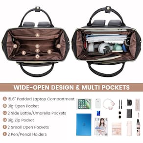 LOVEVOOK Mochila de couro para laptop feminina de 43 cm, bolsa de viagem, mochila de enfermeira, professora, bolsa de computador, laptop, bolsa de trabalho, universidade, negócios, mochila de - Mochila feminina de couro LOVEVOOK atualizada para laptop?: Costuras reforçadas e resistentes. Feita de couro PU à prova d'água de alta qualidade, alças de ombro grossas, alças de couro exclusivas, zíperes antiderrapantes. Resistente e durável. Total de 2 compartimentos e 19 bolsos, fácil de organizar todas as necessidades de trabalho, suprimentos universitários e itens essenciais de viagem. Dimensões: 44,5 x 31,8 x 20,3 cm; Peso: 1,2 kg. - Mochila acolchoada estilosa para laptop ?: Cabe bem em laptops de até 17 polegadas, compartimento para tablet para iPad de 12,9 polegadas. Esta mochila feminina é acolchoada em todos os lados e na parte inferior. O compartimento dedicado para laptop com algodão acolchoado costurado ao redor maximiza a proteção física de seus dispositivos eletrônicos. - Mochila universitária profissional com abertura ampla: as bordas reforçadas e a estrutura de aço do compartimento principal mantêm a forma perfeita da bolsa e o uso durável. Muito espaço para tudo para ajudar a se manter organizado e acessar rapidamente. Profissional e bem feita para o trabalho, negócios, viagens, deslocamento, faculdade, professor, enfermeira, uso diário como um presente prático para mulheres. - ?Ótima mochila de viagem para viajar de avião com porta de carregamento USB?: Tamanho perfeito para caber sob o assento do avião e fixa-se à alça elevada da mala para facilitar a viagem. Nossa mochila de viagem LOVEVOOK de couro está equipada com uma porta de carregamento USB integrada, fácil de carregar seu telefone quando estiver em movimento (não inclui o carregador portátil). - ??Compra sem risco e garantia de qualidade?: A LOVEVOOK está comprometida em fornecer aos nossos clientes mochilas e serviços de alta qualidade. A mochila feminina de couro LOVEVOOK oferece atendimento ao cliente 12 horas, devolução sem motivo em 90 dias e política de garantia de 1 ano.