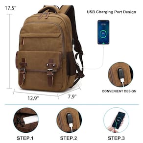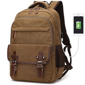 Mochila para laptop - Design vintage e material durável: esta mochila de lona marrom para laptop com porta de carregamento USB apresenta um encaixe magnético clássico na frente, enquanto abre e fecha a bolsa é mais conveniente para adicionar um visual vintage. Feita de lona ripstop premium e acabamento de couro vegano com ferragens sólidas, é multifuncional, durável e leve. Tamanho de mão: 44,5 x 32,8 x 20,1 cm - Capacidade espaçosa com compartimento acolchoado para laptop protege efetivamente seu equipamento digital contra danos: esta mochila para laptop tem um compartimento dedicado com uma alça de nylon interna para proteção extra. Cabe na maioria dos laptops de 15,6 polegadas, o que a torna ótima para o trabalho, faculdade e viagens. O compartimento principal é espaçoso e pode guardar seus itens essenciais diários e muito mais - Muitos bolsos e acesso rápido: esta mochila de lona estilo vintage tem 2 bolsos frontais, 2 bolsos laterais, 2 compartimentos grandes e amplos: 1 compartimento com 2 pequenos compartimentos organizados no interior, 1 compartimento com compartimento para laptop e 1 bolso com zíper. Vários compartimentos e bolsos para guardar seus itens essenciais do dia a dia e pequenos acessórios - Alças de ombro confortáveis e ajustáveis: as alças ajustáveis, acolchoadas e reforçadas, a alça acolchoada e a parte inferior acolchoada aliviam o desconforto em seus ombros, tornando-a confortável de usar o dia todo. Porta de tomada USB integrada pronta para carregar em movimento (bateria não incluída) - Mochila multifuncional: esta mochila para laptop de estilo clássico é perfeita para uso diário como uma mochila de computador de volta à faculdade, uma mochila de trabalho no escritório ou uma companheira leve de viagem para caminhadas e acampamentos. É um ótimo presente para homens ou mulheres especiais em sua vida