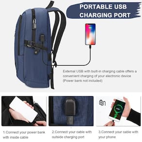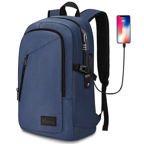 Mancro Mochila para laptop, mochila executiva de 39.6 cm, resistente à água, para homens e mulheres, mochila de viagem com porta de carregamento USB (azul, 39.6 cm) - Tamanho e espaço de armazenamento: mochila para laptop com tamanho para guardar objetos e seu laptop de 15,6 polegadas ou Macbook/laptop de 15,1 polegadas e 14 polegadas. Bolsos principais convenientes para iPad, carregador, fichários, livros, roupas, etc. Bolsos internos mantêm sua carteira e telefone. Bolso frontal inclinado adequado para achados rápidos, como sua identidade para o trabalho, chaves para porta aberta, dois bolsos laterais para garrafa de água e guarda-chuva compacto para organizar seus itens - Design da porta USB: a bolsa resistente para carregamento USB com carregador USB integrado por fora e cabo de carregamento embutido no interior, você pode conectar um hub de energia móvel no interior, basta conectar o cabo USB à mochila do computador e conectar o dispositivo para facilitar o carregamento - Segurança e sólida: zíperes resistentes de acesso duplo com design de bloqueio de combinação antirroubo permitem fácil acesso e aumentam a segurança, o que também pode fornecer um espaço privado para você. A mochila sólida é um presente absolutamente bom para adultos, mulheres e homens - Confortável e resistente: feita de tecido de nylon resistente com duas alças acolchoadas em forma de "S", alivia o desconforto do ombro, o design simples mas confortável das costas oferece um ótimo suporte para as costas, tornando seu trabalho, viagem e viagem mais convenientes onde quer que você vá - Multiuso e tamanho: 45 x 30 x 17 cm, adequada para ser colocada sob seu assento em um avião quando você estiver viajando ou em viagem de negócios. Boa escolha para uma mochila de laptop de negócios, mochila para viagens, mochila de trabalho, bolsa de laptop para homens e mulheres, também será um bom presente para mulheres, presentes para homens, mulheres e bolsa de presente para viajantes. Faixa etária recomendada: a partir de 5 anos