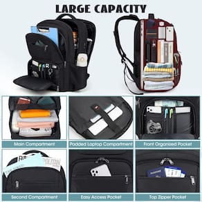 Mochila de viagem para laptop de 17,3 polegadas para homens e mulheres grande com porta carregador USB para faculdade, trabalho, viagens ?Alta qualidade: esta mochila para laptop bem feita é feita de tecido de poliéster impermeável premium, zíper YKK resistente e costura reforçada, que é durável, leve e resistente a rasgos. ? Grande capacidade: mochila extra grande de 43,9 cm com muitos compartimentos e mais de 20 bolsos para ajudar você a organizar todos os seus pertences, proporcionando conveniência para suas viagens e vida diária. ? Compatível com TSA: conveniente no ponto de controle. Compartimento separado para laptop e design plano permitem que você passe rapidamente pela segurança do aeroporto e mantenha sua bagagem arrumada. ? Carregamento USB: o design do orifício de carregamento oculto mantém a mochila em perfeita forma. O orifício de carregamento USB e o conector de fone de ouvido tornam mais conveniente usar o seu dispositivo enquanto carrega a mochila. ?Multiuso: com design clássico e minimalista, perfeita para usar como mochila de laptop, mochila universitária, mochila de trabalho, mochila diária, mochila de viagem, mochila de negócios ou mochila de mão. Que espaço de armazenamento tem esta mala? * 1 compartimento acolchoado separado para laptop de 17,3 polegadas e iPad de 12,9 polegadas; com 1 bolso grande de malha para carregador, mouse pad e outros acessórios. * 1 compartimento principal espaçoso com 2 bolsos abertos de malha para guardar roupas, livros, materiais universitários e acessórios de viagem; * 1 segundo compartimento grande para documentos A4, arquivos comerciais, revistas e assim por diante; * 1 bolso frontal organizado com 2 compartimentos para caneta; 3 bolsos deslizantes; 1 bolso de malha com zíper e 1 chaveiro; * 2 bolsos frontais pequenos com zíper de fácil acesso ao passaporte, fones de ouvido, lenço de papel, bolsa ou outros pequenos acessórios; * 1 bolso traseiro antirroubo para itens importantes como cartões de crédito, carteira de identidade, passaportes. * 2 bolsos laterais de malha para garrafa de água ou guarda-chuva. Especificações -Dimensões: 18,8 x 14,2 x 7,1 polegadas - Tamanho máximo do laptop: 17,3 polegadas -Peso: 1,1 kg - Ocasiões: viagem/viagem de negócios/trabalho/acampamento/estudo no exterior/faculdade - Ótimo presente: escolha de presente ideal para homens e mulheres no aniversário, dia dos namorados, dia das mães, Natal, formatura *NOTA: Este item não é destinado a ser utilizado por crianças menores de 12 anos. Mochila para laptop de 17 polegadas com porta de carregamento USB -- Design atencioso para extrema conveniência - O design do compartimento da mochila é dividido em 3 partes com vários bolsos internos para facilitar a classificação, mantendo seu laptop e itens essenciais organizados. - O design plano pode simplesmente desdobrar em 90 a 180 graus. Garante uma digitalização TSA conveniente e rápida. - O bolso frontal de fácil acesso facilita a obtenção do que você precisa. - O bolso traseiro com zíper permite que você obtenha facilmente o que precisa, combinando segurança com facilidade de uso. Detalhes requintados. *Fivelas D penduram óculos de sol e outros itens pequenos. A alça refletiva das mochilas torna as viagens noturnas mais seguras. O gancho removível para chave torna seus itens organizados e mais fáceis de encontrar. Transporte confortável. * Esta mochila tem painel traseiro ergonômico bem acolchoado para convecção de ar, ventilação e eliminação de calor. Alças de ombro de malha respirável ajustáveis para ajudar a aliviar a pressão no ombro. A alça traseira para bagagem permite que esta pasta deslize sobre o tubo de bagagem, liberando suas mãos. - ?Vários bolsos e organizada?Esta mochila tem mais de 15 bolsos para manter seus itens organizados. Um compartimento separado para laptop de 17,3 polegadas e iPad de 12,9 polegadas; compartimento principal para itens essenciais diários e acessórios eletrônicos; o segundo compartimento comporta notebook, arquivos A4 e fichários; bolsos organizadores frontais com chaveiro, 2 compartimentos para caneta, 1 bolso com zíper de malha e 3 bolsos deslizantes; 2 bolsos frontais com zíper para fácil acesso; 1 bolso traseiro antirroubo e 2 bolsos laterais de malha. - ?Mochila de grande capacidade e alta qualidade?Mochila para laptop Dimensão: 48 x 36 x 18 cm (A × L × P); Peso de 1,1 kg; Capacidade: 45 L. Feita de tecido de poliéster de alta qualidade e forro de nylon de alta densidade, a mochila de viagem extra grande para homens e mulheres é resistente à água, resistente a rasgos, resistente ao desgaste e antirrugas. Zíperes YKK suaves e resistentes, alça superior durável e costura reforçada em cada ponto de desconforto tornam a mochila de computador mais durável para uso prolongado. - ?Mochila TSA Friend?A mochila de viagem possui um design prático que pode ser aberto livremente de 90 a 180° para ajudar você a passar pela segurança do aeroporto rapidamente e manter sua bagagem organizada. Mochila de mão perfeita para viagens de avião que cabe em caixas aéreas e sob assentos de voo. A alça de bagagem desliza sobre o tubo de bagagem para facilitar o transporte. Perfeita para usar como mochila de viagem, mochila de laptop, mochila de negócios, mochila de bagagem, mochila noturna, bolsa de mão e mochila de acampamento. - Mochila USB multifuncional: com uma porta de carregamento USB na lateral, esta mochila oferece uma maneira mais conveniente de carregar seu telefone enquanto caminha (Observação: carregador portátil e cabo não incluídos). O conector de fone de ouvido facilita o uso dos fones de ouvido. Alças de ombro com fivela em D para pendurar óculos de sol. O bolso traseiro oculto antirroubo mantém seus itens importantes seguros. Adequado para trabalho, faculdade, acampamento, escapadelas de fim de semana e viagens noturnas. - ?Mochila confortável e conveniente? Design