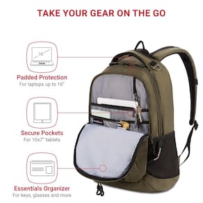 SwissGear Mochila para laptop Cecil 5505, Oliva, Mochila para laptop Cecil 5505 - Qualidade premium: feita de poliéster Ripstop 600D resistente, este pacote incorpora longevidade integrada através de materiais e funcionalidade moderna. - SILHUETA ESPAÇOSA DE TRÊS COMPARTIMENTOS: um pacote ideal para viajantes e profissionais, sua estrutura organizada inclui três compartimentos grandes para armazenar tudo, desde pequenos itens essenciais de escritório até uma jaqueta extra. - Bolsos econômicos e organizador externo: proteja seus dispositivos dentro de um bolso interno acolchoado para laptop de 15 polegadas. Os bolsos laterais elásticos acomodam garrafas de água, enquanto um bolso organizador frontal de acesso rápido permite que você alcance facilmente a identidade e as chaves. - Confortável: com alças de ombro acolchoadas ergonomicamente contornadas e um painel traseiro de fluxo de ar respirável, seu sistema traseiro ventilado permite melhor respirabilidade e absorve o peso de uma carga pesada. Uma alça superior acolchoada permite que você pegue e saia facilmente. - Dimensões: Exterior – 45.7 cm x 33.0 cm x 15.2 cm; Compartimento para laptop – 33.7 cm x 27.9 cm x 2.5 cm; Bolso para tablet – 25.4 cm x 17.8 cm; Capacidade – 27.3 litros - Este item não se destina a ser utilizado por crianças menores de 12 anos.