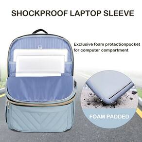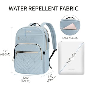 VANKEAN Mochila feminina para laptop de trabalho, elegante com porta USB, Acolchoada azul claro, Mochilas Daypack - Mochila com design azul e repelente de água: as mochilas femininas VANKEAN azul claro para laptop têm zíperes banhados a ouro requintados e textura de costura moderna. Detalhes do tamanho: 43 cm A x 32 cm C x 19,8 cm L. Peso 0,8 kg e fácil de transportar. O material exterior da mochila leve e elegante da VANKEAN é de nylon impermeável e resistente a arranhões com um interior de poliéster personalizado totalmente forrado e resistente a rasgos. - Mochila multifuncional com compartimento para laptop: Total de 5 compartimentos e dois bolsos laterais - 1 compartimento separado para laptop de 15,6 polegadas - além de uma capa extra acolchoada para tablets ou Kindle, 1 compartimento principal pode armazenar alto-falantes e arquivos comerciais enquanto ainda tem espaço para necessidades diárias, 1 compartimento frontal e 2 bolsos frontais oferecem muita capacidade para a organização - cartões, carteira, óculos de sol, etc. - Design da porta do carregador USB: as mochilas para laptop VANKEAN têm uma porta de carregamento USB externa e um cabo de carregamento embutido que pode ser facilmente conectado onde quer que você esteja (carregador portátil não incluído). Esta mochila USB oferece a você uma maneira mais conveniente de carregar seu telefone enquanto estiver em movimento. - Capa de proteção para laptop à prova de choque: o compartimento dedicado para laptop cabe em um laptop de até 15,6 polegadas, acolchoado com um bolso exclusivo de proteção de espuma para o seu laptop, além disso, o fecho aderente pode fixar o computador para evitar que ele caia. O compartimento para tablet serve para iPad de até 12,9 polegadas. Bolsos de malha para mouse, adaptador, cabo de carregamento. Tenha uma bolsa VANKEAN para computador, deixe-a proteger a segurança do seu computador. - Presentes confortáveis e ideais: alças ergonômicas, 1 alça superior durável - projetada para transporte confortável o dia todo. Chegue com estilo – uma alça de bagagem para deslizar facilmente sobre as alças da bagagem/mala. Elegante e sofisticada, esta mochila é perfeita para o trabalho, faculdade, negócios, viagens ou uso diário. Também é um ótimo presente para o trabalho, esportes, caminhadas, piqueniques, praia, acampamento, viagem de negócios, etc.