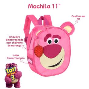 Características: - Mochila 11" - Estampa fofa e exclusiva do Lotso - Logo emborrachado - Fechamento com zíper reforçado - Chaveiro emborrachado com cheiro de morango