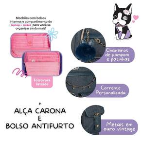 Esse kit é pura versatilidade e estilo A mochila de costas RB27024 combina jeans, detalhes em ouro velho e muito espaço para organização. Além do compartimento para notebook, traz quatro bolsos frontais um com divisórias internas , bolsos laterais telados e bolso antifurto. As alças acolchoadas oferecem muito conforto, junto com alça de mão reforçada e alça carona. Acompanha chaveiro de pompom, correntinha com strass e cartela de adesivos exclusivos. Dimensões: 44x33x14cm. A lancheira RB27028 é térmica 2 em 1, podendo ser Utilizado como lancheira tradicional, transversal ou mochilinha. Conta com bolso frontal menor, bolsos telados laterais e amplo espaço interno com revestimento térmico. Dimensões: 27x20x12cm. O estojo RB27026 garante organização total com seus 36 elásticos, estojo interno com zíper e capacidade para até 100 itens de escrita. Dimensões: 22x16x6cm. Marca: Não Informado