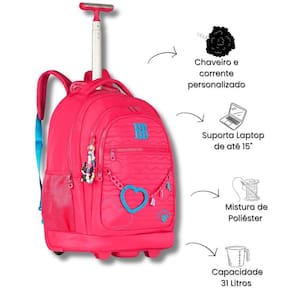 Mochila Rebecca Bonbon De Rodinhas Juvenil Escolar Mala Teen - Clio Style A Mochila Rebecca Bonbon é perfeita para meninas que buscam praticidade e estilo. Feita com materiais de alta qualidade, essa mochila de rodas é resistente e espaçosa, ideal para carregar livros, cadernos e outros itens escolares. Possui compartimentos bem organizados, alças convenientes e acolchoadas para maior conforto, além de um design moderno e delicado, com detalhes que encantam. Características Mochila: Alça de mão e costas Bolsos laterais telados Bolso interno para lápis e caneta Chaveiro e corrente personalizado Mascote em 3D Forro rosa logado Puxador personalizado Zíper tratorado Cadarço acetinado logado Placa de metal colorida Proteção para asas e rodas Especificações Mochila: Marca: Rebecca Bonbon Medidas Aproximadas Mochila A x L x P : 48cm x 35cm x 19cm Altura com a haste levantada: 98cm Aprox Peso: 2.022kg Aprox Capacidade: 31L Composição do produto: Poliéster Polegadas: 19 Compartimento para Notebook: 15 Conteúdo da Embalagem: Rb27009 - 1 Mochila de Rodas Rebeca Bonbon As cores podem variar entre as imagens mostradas acima e o produto. Imagens meramente ilustrativas. Todas as informações divulgadas são de responsabilidade exclusiva do fabricante. de 90 dias contra defeito de fabricação. Marca: Não Informado