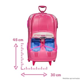 Especificações (Mochila): - Marca: Diplomata - Modelo: Barbie Carro Conversível - Composição: Estrutura em EVA 80% e Poliéster 20%, Base em PVC e Carrinho em alumínio. - Medidas aproximadas: 45 cm(A) x 30 cm(L) x 20cm(P)