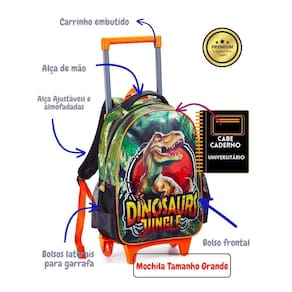 Características: - Conjunto de mochila de rodas costas e lancheira térmica com estampa estilizada de dinossauro. - Mochila produzida em poliéster resistente. - Mochila com 1 divisão grande e 2 bolsos laterais em redinha. - Alças acolchoadas de costas para maior conforto. - Alça de carrinho com 02 rodinhas para facilitar o transporte. - Mochila com 1 bolso frontal com zíper. - Zíperes com puxadores personalizados. - Dimensões da mochila: 40 x 29 x 13 cm altura x largura x profundidade . - Lancheira térmica produzida em poliéster resistente. - Lancheira com alças de costas para facilitar o transporte. - Material interno térmico para manter os alimentos frescos. - Zíperes com puxadores personalizados. - Estampa estilizada de dinossauro. - Dimensões da lancheira: 22 x 20 x 8 cm altura x largura x profundidade .