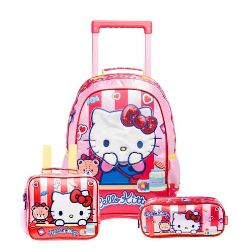 Kit Escolar Hello Kitty com Mochila de Rodas + Lancheira Térmica + Estojo Duplo – Infantil Meninas