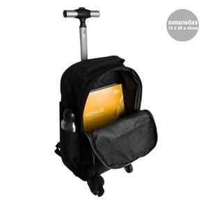 Essa mochila também possui alça de mão e bolso lateral, ideais para guardar pequenos objetos e garrafinha. Suas medidas são: l 29 x a 42 x p 13cm, e a medida da haste estendida é de 100cm.