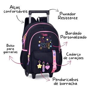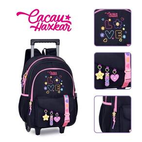 A mochila de carrinho da coleção Cacau Haxkar é aquele modelo que conquista à primeira vista, cheia de estilo, personalidade e detalhes que fazem toda a diferença no dia a dia escolar. Confeccionada em poliéster soft, traz acabamento caprichado com logo bordado, cadarços acetinados e puxadores de metal com corda, além de pingentes emborrachados super charmosos que deixam a peça ainda mais divertida e atual. Seu compartimento principal é amplo e ideal para acomodar livros, cadernos e pastas com facilidade. Na parte frontal, a mochila conta com um compartimento espaçoso com divisórias internas que ajudam na organização, além de um bolso adicional de fácil acesso. Os bolsos telados nas laterais são perfeitos para garrafinhas ou pequenos objetos, garantindo praticidade durante a rotina escolar. O sistema de carrinho facilita o transporte, oferecendo mais conforto para crianças e tranquilidade para os pais. Dimensões aproximadas: 40 x 30 x 13 cm. A lancheira térmica complementa o kit com muito charme e funcionalidade. Possui compartimento principal espaçoso com revestimento térmico, fechamento por zíper, bordado exclusivo da coleção, alça de mão, alça de ombro ajustável e alça carona, facilitando o transporte junto à mochila. Um conjunto pensado para quem gosta de tudo combinado, organizado e com muito estilo. Dimensões aproximadas: 18 x 23 x 10 cm. Marca: Não Informado