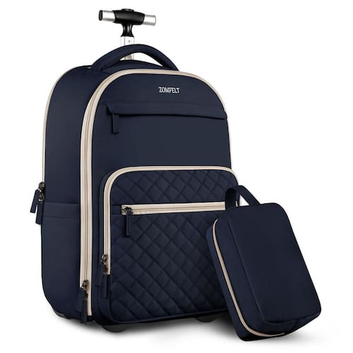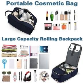 Mochila de rodinhas, mochila de viagem com rodas para mulheres - Mala e mochila 2 em 1: a mochila de rodinhas equipada com haste de liga de alumínio, rodas antiderrapantes e alças de ombro ocultáveis, você pode alternar entre mochila de mão e mala de viagem, atendendo a diferentes necessidades de uso em viagens. Adequada para mochila de viagem, bagagem de mão e bolsas de fim de semana para mulheres com viagem de 3 a 5 dias. - Vários compartimentos: a mochila com rodas tem uma cabine de laptop de 43.2 cm e uma cabine PAD de 32.8 cm, acolchoamento de espuma espessa protege seu dispositivo contra danos; o compartimento principal tem espaço de armazenamento suficiente para guardar itens pessoais e faixas elásticas integradas para evitar que suas roupas caiam; muitos bolsos organizadores mantêm seus itens organizados. - Tamanho adequado para voo: o tamanho da mochila com rodas é de 51 x 35 x 20 cm, projetada para atender à maioria dos regulamentos e requisitos de voo das companhias aéreas (Delta/Sudoeste/United Airlines etc.) e os requisitos para bagagem de mão, cabe perfeitamente no compartimento de bagagem da aeronave e sob o assento. Pode ser seu parceiro de viagem confiável. - Bolsa de higiene pessoal elegante: a bolsa de higiene pessoal extra pode proporcionar maior conveniência para sua viagem. O volume de cerca de 3,5 L pode acomodar itens essenciais para sua viagem, como cosméticos, produtos para a pele e produtos de higiene pessoal; não precisa se preocupar com bagunça e perda durante sua viagem, você pode pegá-la a qualquer momento; - Bolsa esportiva de ampla aplicação: se você está procurando uma prática para mulheres de viagem, seria uma ótima opção. Bolsa de mão grande de 40 L para guardar roupas, acessórios de viagem. O nylon resistente à água garante a qualidade do produto; a alça telescópica pode ser ajustada a duas alturas e reduzir a pressão ao viajar. Use-a como uma bolsa de viagem de avião, bolsa de fim de semana, mochila de transporte e mochila para laptop. Idade: acima de 12 anos.