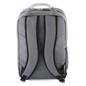 Mochila com bolso interno para notebook em tecido poliéster, com alça de mão em metal e alças de ombro acolchoadas, com bolso lateral em malha e bolsos frontais com zíper.