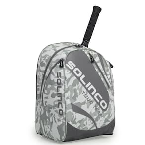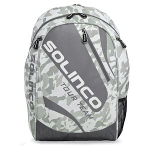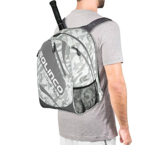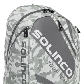 - Detalhamento: Ela possui dois compartimentos principais com fechamento em zíper, sendo um deles com capacidade para até duas raquetes sem capa. Além disso, ela conta com dois bolsos frontais na diagonal e um outro bolso lateral em mesh, ideal para guardar pequenos objetos ou garrafas de água. As alças da mochila são acolchoadas e ajustáveis, proporcionando maior conforto e ergonomia para as costas. O design da mochila é moderno e elegante, combinando as cores cinza e branca em uma estampa camuflada. A mochila também tem o logo da Solinco, uma marca especializada no desenvolvimento e produção de equipamentos de tênis da mais alta performance;