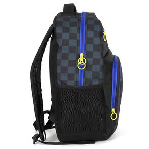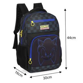Características da Mochila Escolar: - 1 Bolso Principal com bastante espaço - 2 Bolsos Frontais com fechamento em zíper - 2 Bolsos laterais para squeeze - Alças de costas acolchoadas e ajustáveis - Alça de mão reforçada na parte superior - Puxadores personalizado - Estampa Sonic em alto relevo - Material: 100% Poliéster - Forro: 100% Poliéster