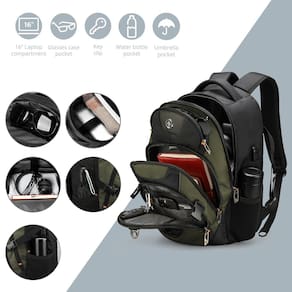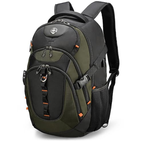 A mochila para laptop empresarial Swissdigital Design com porta de carregamento USB inteligente A mochila de viagem serve para laptops de 15,6 polegadas - PORTA DE CARREGAMENTO USB INTEGRADA: equipada com uma porta USB que oferece acesso rápido para carregar seu telefone e outros dispositivos eletrônicos como iPhone, iPad, Kindle e todos os outros dispositivos USB de forma conveniente. A porta de carregamento USB integrada permite que você use o dispositivo enquanto ele carrega e caminhe ao mesmo tempo (a bateria portátil NÃO ESTÁ INCLUÍDA — nenhuma bateria específica é necessária). - PROTEJA SUA PRIVACIDADE COM UM BOLSO DE PROTEÇÃO RFID INTEGRADO: Viaje sem preocupações. O compartimento de proteção RFID protege seus dados pessoais de serem acessados por scanners RFID (por exemplo, cartões de crédito, passaportes e carteiras de motorista). - SISTEMA ADD-A-BAG: O sistema Add-A-Bag facilita sua viagem. Uma alça de bagagem permite que você conecte sua mala à mochila e, assim, puxe com uma mão. Sua viagem se tornará imediatamente muito mais fácil e agradável. - CAPACIDADE EXTRA GRANDE: contém compartimentos independentes para ótimo armazenamento e organização de diferentes itens. Vários compartimentos principais e bolsos laterais para fornecer o espaço de que suas coisas importantes precisam. - PROJETADO PARA PROPORCIONAR CONFORTO: O sistema de ventilação 3D mantém as costas frescas. As alças ergonômicas acolchoadas curvas em “S”: 0,3" a 0,5" mais largas que as mochilas tradicionais, distribuem melhor o peso. Isso faz com que os ombros se sintam mais confortáveis e menos sobrecarregados. - Patente dos EUA nº. : EUA 10.574.071 B2;EUA 10.931.137 B2;EUA 10.931,138 B2;EUA 11.601.009 B2