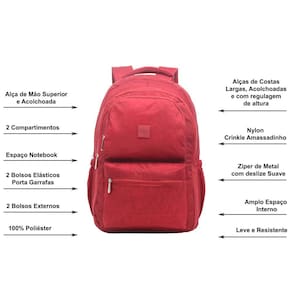 Mochila Feminina Masculina Nylon Amassadinho Tactel para Trabalho, Academia, Escolar, Ginástica, Camping, Lazer etc com visual moderno em Nylon Amassadinho Crinkle Tactel, excelente para uso no dia a dia e carregar seus objetos pessoais, levar em um passeio, na escola e trabalho. Possui 2 compartimentos +2 bolsos externos grandes +2 bolsos laterais com elástico. No compartimento principal possui um bom espaço para acomodar seus objetos e espaço para notebook, tablet, cadernos etc. Os bolsos externos são fechados com zíper com acesso rápido para carregar celular, chaves e pequenos objetos. Nas laterais contém 2 bolsinhos com elástico para levar acessórios como garrafas, latinhas e pequenos objetos. Todos os zíperes são em metal de fácil deslize. BENEFÍCIOS1. Atendimento pós venda para suprir todas as suas necessidades desde o momento da compra até a entrega do produto.2. Produto em Nylon Tactel com resistência e durabilidade, com ótimo custo x benefício.3. Produto com design moderno e atual.4. Garantia de Fábrica contra defeitos de fabricação.CARACTERÍSTICASConfeccionada em Nylon Tactel Amassadinho Crinkle resistente em cor lisa2 compartimentos grandes fechados com zíper1 espaço para notebook, tablet, caderno, livros, etc.2 bolsos externos frontais grandes fechado com zíper de acesso rápidoForro interno em cor lisa em nylon2 Bolsinhos Laterias Elásticos para pequenos objetosAlças de ombro anatômicas com ajuste / regulagem de tamanho1 Alça de MãoMEDIDAS EXTERNASAltura : 44 cmLargura: 29 cmProfundidade : 14 cmGARANTIA E QUALIDADEGarantia - 30 dias para defeitos de fabricaçãoQualidade - Nossos produtos são comercializados em parceria com grandes fábricas de bolsas e mochilas, que garante nossa qualidade dos produtos.