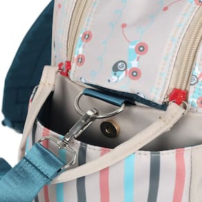 Compartimentos inteligentes: - 1 bolso principal espaçoso, com bolso interno, um bolso lateral térmico interno, dois bolsos internos frontal com separação, ideal para manter todos os itens organizados. - 2 bolsos frontais externos, sendo um deles com fechamento em zíper, e outro bolso com separação e fechamento em fita aderente. - 2 bolsos laterais, sendo um com fechamento em botão de pressçao perfeito para mamadeiras, garrafinhas e acessórios, e outro com fechamento em zíper com acesso lateral, ideal para lenços umedecidos. - 1 bolso traseiro com fechamento em zíper, discreto e seguro para objetos pessoais.