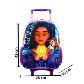 A mochila de rodas possui uma divisão grande, ideal para acomodar todos os materiais escolares, como cadernos, livros e estojos. Seus zíperes com puxadores personalizados facilitam o acesso aos itens guardados, além de dar um toque especial ao visual da mochila. Com dimensões de 42 x 30 x 15 cm altura x largura x profundidade , a mochila é espaçosa e confortável de usar.