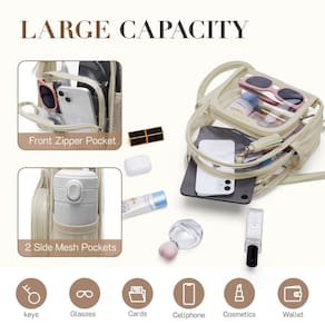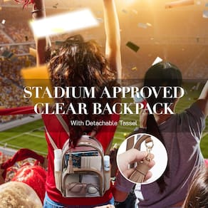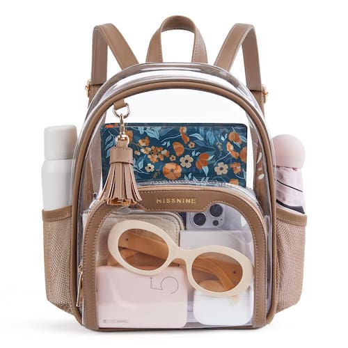 Missnine Mochila transparente aprovada pelo estádio, mini bolsa transparente de PVC grosso com acabamento de couro para eventos esportivos, shows, festivais, bronzeado - Tamanho perfeito para eventos de estádio – 21 cm (C) x 8,4 (L) x 26,2 cm (A). A bolsa transparente é completamente transparente para facilitar a verificação de segurança, não apenas para eventos esportivos, mas também para estádios, shows, festivais, jogos de futebol - Tamanho pequeno e espaçoso o suficiente: a mini mochila transparente com compartimento principal tem muito espaço para celular, cosméticos e uma carteira. Os dois bolsos laterais de tela podem guardar garrafa ou guarda-chuva dobrável. O bolso frontal é adequado para chaves, bilhetes e batom - Material atualizado – Feito especialmente de material de PVC espesso de 0,5 mm, resistente à água e à prova de frio, o que torna a mochila transparente fácil de limpar - Bolsa transparente moderna: com acabamento em couro PU, o design exclusivo a torna excelente. É a melhor escolha para quem valoriza estilo, função e conveniência - Detalhes duráveis: mochila pequena transparente com pontos de alça reforçados que evitam rasgos. Adotamos zíperes de metal SBS premium, é resistente e suave - Linda mochila transparente: o tamanho mini e a decoração de borla fazem com que pareça chique e moderna. Presente para ela em aniversários, Dia dos Namorados, Dia das Mães, Dia da Mulher, Dia de Ação de Graças, Natal, Ano Novo, etc