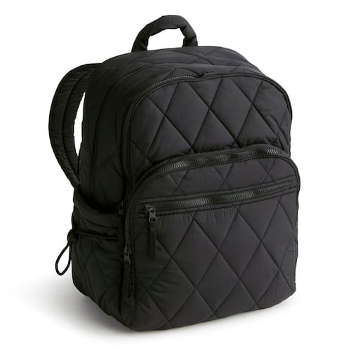 Vera Bradley Mochila feminina de nylon grande Bancroft, Noite sem lua - NYLON – Experimente a melhor mistura de suavidade e desempenho com estilos superleves, repelentes à água e acolchoados com diamante; feito de nylon 100% reciclado, este tecido leve é perfeito para a vida em movimento; forro de poliéster - Tamanho – Este modelo mede 43 cm de altura, 30 cm de largura e 20 cm de profundidade; possui uma alça ajustável de 89 cm e uma alça de 5 cm; acomoda um laptop de até 15 polegadas - Detalhes: o exterior inclui três compartimentos com zíper, bolso frontal com zíper, bolso com zíper para laptop e capa de carrinho; o compartimento frontal com zíper tem quatro bolsos deslizantes e caneta deslizante; o compartimento frontal tem dois bolsos deslizantes e um bolso com zíper; fechos com zíper; repelente à água - Cuidados – Limpe com detergente neutro e um pano macio e úmido, enxágue completamente; secar na horizontal
