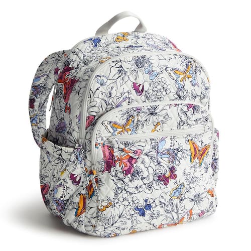 Vera Bradley Mochila feminina de algodão premium Bancroft, Asa + flor - ALGODÃO PREMIUM - Feito com melhor algodão com fibras de algodão natural de alta densidade, nosso algodão lavável proporciona uma sensação luxuosa que rejuvenesce a experiência macia, confortável e vibrante que você lembra desde o início - Tamanho – Este modelo mede 41 cm de altura, 30 cm de largura e 20 cm de profundidade; possui uma alça ajustável de 89 cm e uma alça de 5 cm; acomoda um laptop de até 15 polegadas - Detalhes – o exterior inclui um bolso frontal com zíper, dois compartimentos com zíper, um compartimento para laptop e uma capa de carrinho; o bolso frontal com zíper contém quatro bolsos deslizantes e um bolso para caneta; o compartimento principal contém dois bolsos e um bolso com zíper; fechos com zíper - Cuidados – Lavar à máquina a frio com cores semelhantes, ciclo delicado, apenas alvejante sem cloro quando necessário; secar no varal