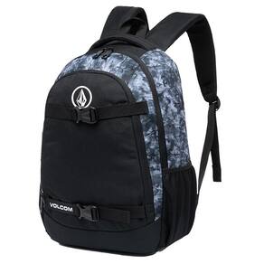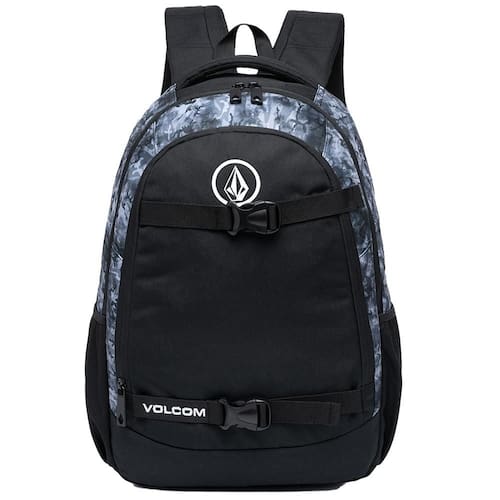 Mochila Volcom em poliéster 900D, tiras com engate de pressão para skate, com compartimento principal grande, um menor na parte frontal e compartimento para notebook de até 15,6", silks frontais e etiquetas personalizadas.