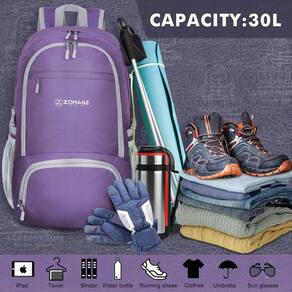 ZOMAKE Mochila leve e embalável de 30 L – Mochilas de caminhada dobráveis resistentes à água compactas e dobráveis para viagens (Roxa) - Mochilas leves embaláveis de grande capacidade 30 l: nossa mochila leve de acampamento tem capacidade de 30 L, grande capacidade, muitos bolsos. Há uma bolsa principal com uma mochila, divisória interna; duas bolsas frontais, duas bolsas laterais e um bolso de privacidade. Seja roupa ou um certificado de viagem, você pode colocá-la em uma mochila. A mochila embalável de 30 L atende às necessidades de sair - 300 g de mochila portátil leve e embalável: o tamanho da mochila dobrável leve é de 48 x 33 x 19 cm, e o tamanho dobrável é 25,4 x 20,3 x 7,6 cm. Quando você não usar mochilas leves dobráveis, você pode dobrá-la em um bolso compacto (tamanho de sanduíches) e depois abrir a mochila quando usada. A mochila dobrável que não ocupa espaço é uma bom ajudante para caminhar compras, passear e passear com cães - Mochila dobrável leve de qualidade: nossa mochila de viagem leve embalável é feita de materiais de nylon para resistência à água e resistência a rasgos, e o desempenho de resistência à água é bom (observação: {corporation} completamente à prova d'água). Usamos novos processos de camada dupla resistente ao desgaste para fortalecer a sutura da mochila de nylon embalável. Um zíper feito de metal SBS bidirecional e materiais de resina de alta qualidade para evitar ficar preso no zíper. O zíper suave pode lhe dar um bom senso de experiência - Design mais recente: projetamos uma mochila leve que pode ser embalada de acordo com os princípios da ergonomia e com foco na conscientização da proteção de segurança. A mochila dobrável de viagem tem a fivela e o apito de proteção do peito. Quando encontrar uma emergência, você pode soar o apito esperando pelo resgate. Há também faixas de fivela de proteção na bolsa lateral para evitar que a garrafa de água e o guarda-chuva sejam colocados na bolsa lateral. O refletor em ambos os lados da bolsa frontal pode fazer você se sentir mais Seguro à noite - A premiada mochila dobrável Zomake: nossa mochila embalável ZOMAKE oferece serviços de qualidade para 500.000 pessoas no mundo com qualidade de alta qualidade e recebeu elogios de muitas pessoas. Acreditamos que nossa mochila dobrável leve será a parceira em sua vida. Você pode acompanhá-lo a pé, férias, compras, ciclismo e exercícios