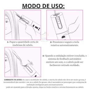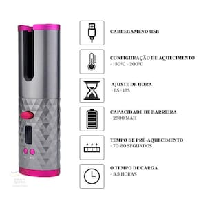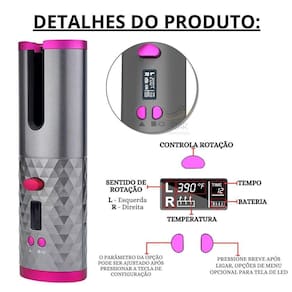 Modelador De Cachos Automático Portátil Recarregável Cabelos Cor: Rosa Claro com Rose O modelador de cachos que apresentamos é tudo o que você precisa para ter cabelos incríveis em qualquer lugar. Com seu carregamento bivolt, você pode usar em qualquer lugar do mundo sem preocupações. Além disso, sua função de bateria sem fio permite que você use sem precisar se preocupar com a falta de tomada. Prático e moderno, nosso modelador é perfeito para as mulheres que não tem tempo a perder. Com a tela LED grande e o display LCD, você pode visualizar a temperatura, direção e indicador de bateria em um piscar de olhos. E falando em temperatura, nosso modelador oferece 6 níveis, variando de 150º até 200º, para que você possa escolher o melhor para o seu tipo de cabelo. E o melhor de tudo Com nosso modelador de cachos, você pode ter cabelos lindos em qualquer lugar e economizar tempo no processo. Imagine a Liberdade de criar lindos cachos enquanto viaja ou se prepara para um evento importante. Então, não perca mais tempo e garanta já o seu modelador de cachos para ter cabelos deslumbrantes a qualquer hora e em qualquer lugar. ------------------ATENÇÃO------------------Recomendamos dar carga de 3 horas antes do primeiro uso. ------------------PERGUNTAS FREQUENTES------------------ O modelador de cachos é fácil de usar para iniciantes R: Sim, o modelador de cachos é fácil de usar, mesmo para iniciantes. O display LCD fornece instruções claras e a temperatura pode ser facilmente ajustada para garantir que os contornos perfeitos. Como eu sei qual é a temperatura ideal para o meu tipo de cabelo R: O modelador de cachos tem seis níveis de temperatura, variando de 150º a 200º. Normalmente, cabelos finos requerem temperaturas mais baixas, enquanto cabelos mais grossos podem suportar temperaturas mais altas. Recomendamos começar com uma temperatura mais baixa e aumentar gradualmente para encontrar uma temperatura ideal para seu tipo de cabelo. O modelador de cachos vem com um acessório ou bolsa de transporte R: Sim, o modelador de cachos vem com uma bolsa de transporte para facilitar o transporte e proteger o aparelho durante o transporte, um pente e 2 prendedor de cabelo. É possível usar o modelador de cachos em cabelos úmidos R: Não, recomendamos usar o modelador de cachos em cabelos secos para evitar danos ao cabelo. O modelador de cachos oferece opções de direção para os cachos R: Sim, o modelador de cachos oferece opções de direção para os cachos, permitindo que você crie cachos em diferentes direções e estilos. ------------------ESPECIFICAÇÕES------------------Altura: 19 cm.Largura: 6 cm.Configuração de aquecimento: 150º - 200ºNíveis de temperaturas: 6 Níveis Tempo de pré-aquecimento: 70 - 80 Segundos. ------------------CONTEÚDO------------------1x Modelador de Cachos.1x Pente de Cabelo.2x Prendedor de Cabelo.1x Cabo USB.1x Manual. Marca: Star Capas E Acessórios