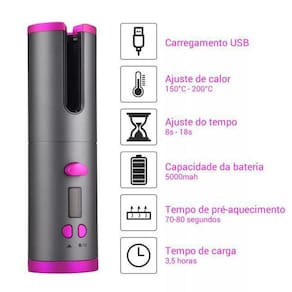 É sem fio, você carrega via usbpode controlar a temperatura, alterar a posição dos cachos tanto para a direita quanto para a esquerda e o tempo que o cacho fica no aparelho é de 8 a 20 segundos