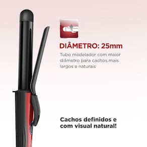 Informações Adicionais do Produto: O revestimento cerâmico distribui o calor de maneira uniforme e garante proteção aos fios durante a modelagem. Resultado duradouro, brilhante e sem frizz. O tubo com diâmetro de 25mm proporciona cachos mais largos e naturais. A temperatura constante de 210°C é ideal para modelar o cabelo com facilidade e rapidez. O suporte de apoio permite que você apoie o modelador durante o uso com mais segurança. O fio é giratório e não enrola durante o uso.