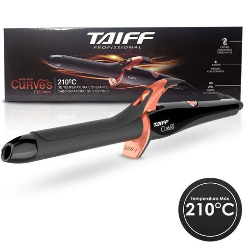 - Marca: Taiff - Modelo: Modelador Curves 25mm - Revestimento Cerâmica - Cabo Giratório 3 Metros - Cor: Preto - Bivolt automático - Tecnologia cerâmica - Led indicador de Ligado / Desligado - Diâmetro do tubo do modelador: 25 milímetros - Potencia: 0.48W - Temperaturas: 210c° - Dimensões do produto com embalagem (compr. x larg. x alt.): 324 X 89 X 39 - Peso 189g - Dimensões do produto sem embalagem (compr. x larg. x alt.): 366 X 48.5 X 106 - Peso 185g