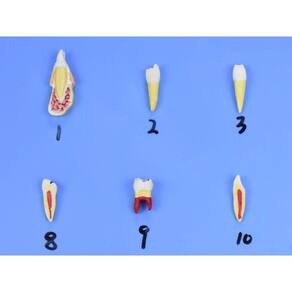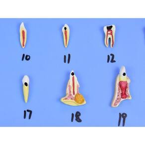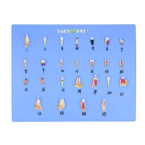Modelo anatômico de patologias dentárias em placa em 25 partes, confeccionado em PVC especial, com pintura feita a mão e cores realísticas; Várias patologias distintas estão representas neste modelo anatômico; Com o modelo anatômico de patologias dentárias com 25 partes SD-5059-M é possível identificar as seguintes estruturas dentre outras: