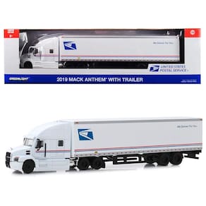 Características Edição Limitada Diecast CollectibleDetailed Diecast Mack Anthem Sleeper Cab com telhado Aero Reboque autêntico com logotipos e gráficos de serviço postal dos Estados Unidos USPS Nós entregamos para você Slogan no TrailerPivoting Fifth Wheel HitchMack Bulldog Ornamento do capô cromado 18 pneus de borracha rolantes lisos, rodas dianteiras não volantes