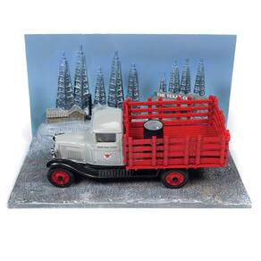 Este modelo diecast na escala 1/43 foi cuidadosamente elaborado para capturar o icônico caminhão plataforma Chevrolet 1930, um veículo clássico conhecido por sua utilidade e design robusto. O modelo apresenta uma carroceria vermelha detalhada e a autêntica marca Texaco, refletindo a importância histórica da indústria petrolífera naquela época. Acompanhando o caminhão, há oito barris de óleo em miniatura e um diorama detalhado com torres de petróleo, que enriquecem a exibição com um cenário industrial realista.