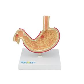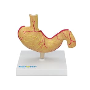 Modelo anatômico patológico do estômago em tamanho real, confeccionado em resina plástica e com pintura feita à mão e cores realísticas, apresenta alta definição anatômica; Com o modelo patológico do estômago em tamanho real SD-5206, é possível identificar as seguintes estruturas dentre outras: * Esofagite; * Úlcera gástrica; * Úlcera duodenal; * Esôfago; * Válvula cárdia; * Músculo da parede do estômago; * Canal gástrico; * Membrana da mucosa; * Arco angular; * Músculo esfíncter pilórico; * Duodeno; * Átrio pilórico; * Fundo da membrana mucosa; * Nervo vago; * Artéria gástrica esquerda; * Artéria gastropilórica esquerda; * Músculo do estômago.