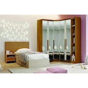 Modulado Closet Completo Espelhado 5 Portas 6 Gavetas - Linea-Cumaru - Móveis Novo HorizonteO Modulado Solteiro Linea possui um excelente padrão de qualidade combinando com qualquer ambiente, agregando beleza e sofisticação. Possui vários compartimentos, espaço para peças penduradas e dobradas, além de nichos que podem acomodar bolsas, roupas de camas, sapatos, brinquedos, decorações e o que mais você precisar para um dia a dia mais prático. Super versátil e elegante, encaixando perfeitamente no seu espaço. Confira e aproveite!Faz parte do anúncio:1 Módulo Cantoneira1 Módulo Canto Oblíquio2 Módulos 2 Portas 3 GavetasObs: Objetos de decoração, cama e colchão não acompanham o produto.Particularidades do Modulado:Características:- 100% MDF- Excelente espaço interno - 15 espelhos, sendo 3 por porta- 8 prateleiras - 6 gavetas com corrediças telescópicas- 4 cabideiros de alumínio- Dobradiças de pressão 35mm Dimensão Total:Altura: 2,36 metrosLargura: 1,64 x 1,94 metrosDimensões Módulo Cantoneira:Altura 2,36 metrosLargura 29,8 centímetrosProfundidade: 56,5 centímetrosDimensões Módulo 2 Portas:Altura 2,36 metrosLargura 80,4 centímetrosProfundidade: 56,5 centímetrosDimensões Canto Oblíquio:Altura 2,36 metrosLargura 82,7 centímetrosProfundidade: 69,5 centímetrosFIQUE ATENTO: Verifique se as medidas disponíveis do seu espaço são compatíveis com as medidas do modulado.Informações Importantes:.- Produtos podem apresentar diferenças de tonalidades entre a foto na tela e o produto real, devido a calibração de cor de tela.- Limpar com flanela ou pano macio. Não utilizar álcool. Não utilizar produtos abrasivos ou corrosivos.- Nós prezamos pela qualidade da entrega em primeiro lugar, trabalhamos com transportadoras altamente selecionadas e os melhores materiais de embalagem.- A montagem é de total responsabilidade do comprador. Antes de comprar, verifique o espaço disponível para a montagem.- Certifique-se de que o produto caiba em elevadores e vãos de escadas, não fazemos içamentos. Quaisquer despesas deste tipo ficam a cargo do cliente- Garantia de 3 meses contra defeitos de fabricação.