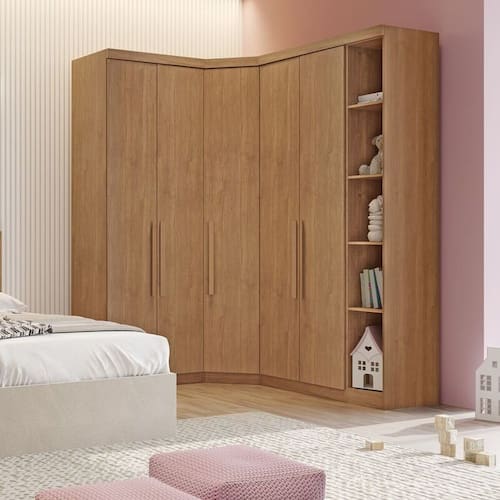 Modulado Completo De Canto Solteiro 5 Portas 6 Gavetas - Linea-Cumaru - Móveis Novo HorizonteO Modulado Solteiro Linea possui um excelente padrão de qualidade combinando com qualquer ambiente, agregando beleza e sofisticação. Possui vários compartimentos, espaço para peças penduradas e dobradas, além de nichos que podem acomodar bolsas, roupas de camas, sapatos, brinquedos, decorações e o que mais você precisar para um dia a dia mais prático. Super versátil e elegante, encaixando perfeitamente no seu espaço. Confira e aproveite!Faz parte do anúncio:1 Módulo Cantoneira1 Módulo Canto Oblíquio2 Módulos 2 Portas 3 GavetasObs: Objetos de decoração, cama e colchão não acompanham o produto.Particularidades do Modulado:Características:- 100% MDF- Excelente espaço interno- 8 prateleiras - 6 gavetas com corrediças telescópicas- 4 cabideiros de alumínio- Dobradiças de pressão 35mm Dimensão Total:Altura: 2,36 metrosLargura: 1,64 x 1,94 metrosDimensões Módulo Cantoneira:Altura 2,36 metrosLargura 29,8 centímetrosProfundidade: 56,5 centímetrosDimensões Módulo 2 Portas:Altura 2,36 metrosLargura 80,4 centímetrosProfundidade: 56,5 centímetrosDimensões Canto Oblíquio:Altura 2,36 metrosLargura 82,7 centímetrosProfundidade: 69,5 centímetrosFIQUE ATENTO: Verifique se as medidas disponíveis do seu espaço são compatíveis com as medidas do modulado.Informações Importantes:.- Produtos podem apresentar diferenças de tonalidades entre a foto na tela e o produto real, devido a calibração de cor de tela.- Limpar com flanela ou pano macio. Não utilizar álcool. Não utilizar produtos abrasivos ou corrosivos.- Nós prezamos pela qualidade da entrega em primeiro lugar, trabalhamos com transportadoras altamente selecionadas e os melhores materiais de embalagem.- A montagem é de total responsabilidade do comprador. Antes de comprar, verifique o espaço disponível para a montagem.- Certifique-se de que o produto caiba em elevadores e vãos de escadas, não fazemos içamentos. Quaisquer despesas deste tipo ficam a cargo do cliente- Garantia de 3 meses contra defeitos de fabricação.