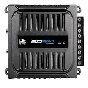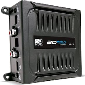O BD800.4 oferece 800Wrms com configuração de 4 canais de 200Wrms a 2 Ohms cada, ou 400Wrms a 4 Ohms em cada Bridge. Esta linha é muito utilizada para sistemas de pequeno e médio portes por aceitar várias configurações de instalação atendendo as mais diversas necessidades do mercado tocando qualquer tipo de alto falante.ESPECIFICAÇÕES TÉCNICAS Potência Máxima 14,4v 2 Ohms: 4 x 230 WRMS Potência Máxima 14,4v 4 Ohms: 4 x 150 WRMS Potência Máxima 14,4v Bridge 4 Ohms: 2 x 460 WRMS Potência Máxima 12,6v 2 Ohms: 4 x 200 WRMS Potência Máxima 12,6v 4 Ohms: 4 x 120 WRMS Potência Máxima 12,6v Bridge 4 Ohms: 2 x 400 WRMS Eficiência 4 Ohms: 82% Eficiência 2 Ohms: 78% Tensão de Entrada: 9 - 16V Impedância de Entrada: 47k Ohms THD+N: 1,5% Sensibilidade de Entrada: 250mV - 3,4V Relação Sinal Ruído: 85dB Resposta em Frequência: 20 a 20kHz -3dBs HPF Subsônico : 90Hz a 20kHz 12dBs/8 Linkwitz-Riley LPF Crossover : 20Hz a 90Hz 12dBs/8 Linkwitz-Riley Fusível Recomendado: 50 A Corrente de Repouso: 700mA Corrente Máxima sinal senoidal : 80 A Corrente Máxima sinal musical : 40 A Cabos de Alimentação mín. Recomendado : 10mm Cabos de Saída mín. Recomendado : 2 x 1,5mm / 2 x 15 AWG Peso Kg : 0,82 Altura mm : 116 Largura mm : 127 Profundidade mm : 53