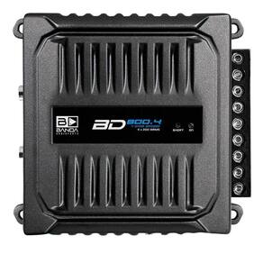 O BD800.4 oferece 800Wrms com configuração de 4 canais de 200Wrms a 2 Ohms cada, ou 400Wrms a 4 Ohms em cada Bridge. Esta linha é muito utilizada para sistemas de pequeno e médio portes por aceitar várias configurações de instalação atendendo as mais diversas necessidades do mercado tocando qualquer tipo de alto falante.