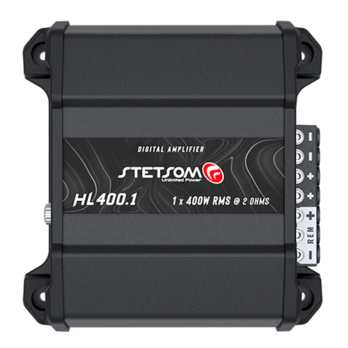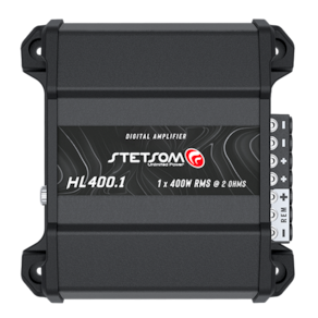 ESPECIFICAÇÕES TÉCNICAS CARACTERÍSTICAS HL400.1 ? 2 OHMS Número de Canais 1 Potência RMS 400W Potência RMS em 2 Ohms 13,8V 1 x 245W Potência RMS em 4 Ohms 13,8V 1 x 410W Potência RMS em 2 Ohms 14,4V 1 x 435W Potência RMS em 4 Ohms 14,4V 1 x 270W Tensão de Alimentação 9V a 15,5V DC Resposta em Frequência 10Hz a 22KHz Crossover Low Pass 60Hz a 22KHz Crossover High Pass 10Hz a 2,5KHz Relação Sinal Ruído >90dB Sensibilidade de Entrada RCA: 200mV / HIGH: 1.5V Impedância de Entrada RCA: 9K Ohms / HIGH: 1K Ohms Impedância Mínima de Saída 2 OHMS Consumo com Sinal Musical 18A Consumo com Sinal Bass 33,7A Dimensões (A x L x C) mm 50 x 125 x 124 mm Peso Kg 482g