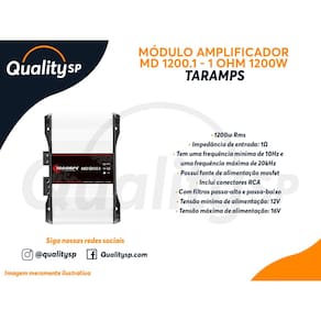 A Taramps apresenta o módulo amplificador MD 1200.1 1ohm. Foi cuidadosamente desenvolvido com a mais alta tecnologia, oferecendo alto rendimento e desempenho para os mais variados sistemas de som automotivo, atendendo toda a gam4 de frequência, em outras palavras, é um módulo FULL RANGE. É um amplificador classificado como mono, tem um canal com potência máxima de 1200 Watts RMS.
