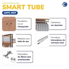 A linha Smart Tube é produzida em estrutura 100% MDF e com acabamento em U.V. com tubos de aço, dobradiças com amortecedor e corrediças telescópicas de extração total. São móveis que otimizam o espaço, possibilitando a criação de ambientes únicos e inteligentes, que atendem as necessidades dos mais variados espaços e estilos de vida. Acabamento da Gaveta: Pintura Texturizada UV Acabamento da Porta: Pintura Texturizada UV Ambiente Principal: Quarto Complexidade da Montagem: Média: pode ser montado por mais de uma pessoa e/ou necessite de maior conhecimento para montagem Composição: 100% MDF e tubos de aço Cor: Angelin Cor do Produto: Angelin Cor Interna: Marrom Escala de Brilho: Semi-Fosco Espessura do Material da Estrutura: 1.8 Gaveta com Chave: Não Itens Inclusos: 1 Módulo e Manual de Montagem Linha ou Coleção: Smart tube Manual de Montagem e Instalação: https://product-hub-prd.madeiramadeira.com.br/875887/documents/9134a6a3-425f-43c0-9a28-2a2411af73fa1619646manuais0052me.pdf Material da Gaveta: MDF Material da Porta: MDF Material do Puxador da Gaveta: Alumínio Material do Puxador da Porta: Alumínio Material Principal: MDF Módulo Individual: Sim Necessita Montagem: Sim Origem do Produto: Nacional Peso: 86 Peso Máximo por Gaveta: 5 Possui Cabideiros: 01 Possui Calceiros: Não Possui Espelho: Não Possui Possui Pés: Não Possui Portas: 02 Possui Prateleiras: Não Recomendações de Uso, Manutenção e Limpeza: Limpeza com pano umedecido. Sistema de Montagem: Minifix Suporta Até (kg): 30 Tipo de Corrediça da Gaveta: Metálica Telescópica Tipo de Dobradiça/Corrediça da Porta: Alumínio Tipo de Puxador da Gaveta: Externo Tipo de Puxador da Porta: Externo Ean: 7909903472354
