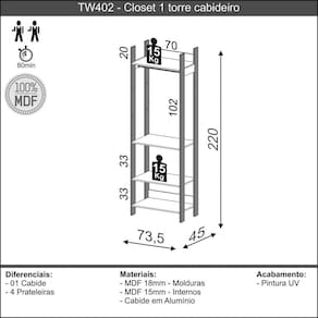 +Closet+Dalla+Costa+1+torre+cabideiro+73%2C6cm-freijo%2Fpreto+fosco+100%25+MDF%2C+para+maior+durabilidade+%E9+aplicado+6+camadas+de+pintura%2C+pode+ser+usado+na+sala+como+divis%F3ria+de+ambientes%2C+super+moderno%2C+conhe%E7a+toda+a+linha+Dalla+Costa Acabamento da Gaveta: Acabamento da Porta: Acabamento da Prateleira: Pintura Acompanha Lâmpada: Não Altura: 220 Ambiente Principal: Quarto calculo: unidade Complexidade da Montagem: Média: pode ser montado por mais de uma pessoa e/ou necessite de maior conhecimento para montagem Composição: MDF Cr: Freijó/Preto Fosco Cr do Produto: Freijó/Preto Fosco Cr Interna: Marrom Escala de Brilho: Fosco Escala de Brilho da Gaveta: Escala de Brilho da Porta: Escala de Brilho da Prateleira: Semi-Fosco Gaveta com Chave: Itens Inclusos: 1 Closet e Manual de Montagem Largura: 73,59999999999999 Linha ou Coleção: TW402 Manual de Montagem e Instalação: https://cdn2.madeiramadeira.com.br/atributo/dalla-costa/534692-tw402.pdf Material da Gaveta: Material da Porta: Material da Prateleira: MDF Material do Puxador da Gaveta: Material do Puxador da Porta: Material dos Pés: Material Principal: MDF Módulo Individual: Sim Necessita Montagem: Sim Origem do Produto: Nacional Painel para TV Integrado: Não Peso: 26,2 Peso Máximo por Gaveta: Peso Máximo por Prateleira: 8 Possui Cabideiros: 01 Possui Calceiros: Não Possui Espelho: Não Possui Possui Gavetas: Não Possui iluminação: Possui Pés: Não Possui Portas: Não Possui Prateleiras: 03 Possui Rodízio: Não Possui Vidro: Não Profundidade: 45 Recomendações de Uso, Manutenção e Limpeza: Limpeza com pano levemente umedecido Resistente à Chuva: Não Rodízio com Trava: Não Sapatas Niveladoras: Sistema de Montagem: Parafusos, cavilhas e minifix status-cadastro: Aprovado Suporta Até (kg): 60 Tamanho: Tipo de Corrediça da Gaveta: Tipo de Dobradiça/Corrediça da Porta: Tipo de Guarda-Roupa: Solteiro Tipo de Puxador da Gaveta: Tipo de Puxador da Porta: