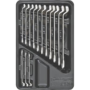 Bandeja em plástico termoformado. As chaves de aperto são produzidas em aço ligado com cromo vanádio (Cr-V), e apos submetidas a testes rigorosos de torque para atender a norma DIN 1711-1. O novo perfil Hyper Drive, em alguns modelos de boca tipo estrela, reduz a fadiga das chaves, prolongando sua vida útil. O teste de dureza é realizado em vários pontos para assegurar a resistência ao desgaste da chave durante o uso ininterrupto. Alguns tipos de chaves de aperto são fornecidos em bitolas métricas e em polegadas, para os diversos fixadores disponíveis. Afrouxar e apertar parafusos e porcas sextavadas e quadradas. As ferramentas são produzidas e testadas conforme normas específicas.