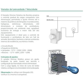 O Variador Dimmer Rotativo da Alumbra propicia o controle gradual de cargas compatíveis com dimerização, permitindo o ajuste mínimo até o máximo da potência de lâmpadas incandescentes, halógenas, eletrônicas dimerizáveis, LED dimerizáveis e motores de ventiladores, proporcionando um ambiente mais agradável, economia de energia e maior vida útil dos equipamentos.