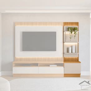 Fabricado em MDP e MDF de alta qualidade, o módulo conta com iluminação LED que destaca suas decorações e cria uma atmosfera acolhedora. O design moderno com detalhe ripado e acabamento em Tauari/Off White Fosco faz deste móvel uma adição elegante e funcional à sua sala.